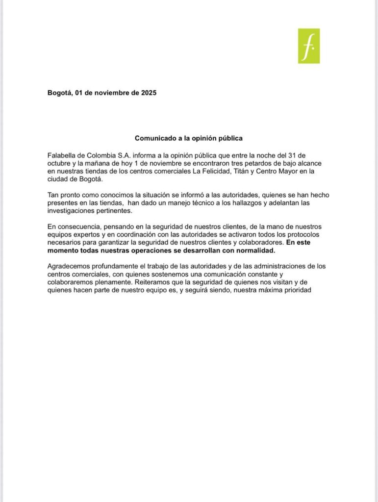 Momentos de preocupación se vivieron en Bogotá tras el hallazgo de tres petardos de bajo alcance en tiendas de la cadena Falabella ubicadas en los centros comerciales La Felicidad, Titán Plaza y Centro Mayor. Los artefactos fueron encontrados entre la noche del 31 de octubre y la mañana del 1 de noviembre, justo durante las celebraciones de Halloween.