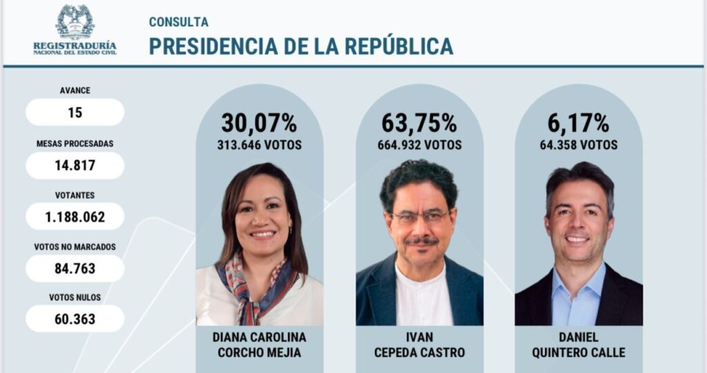 El senador Iván Cepeda Castro fue elegido este 26 de octubre como el candidato presidencial del Pacto Histórico, tras imponerse en la consulta interna de la coalición de izquierda afín al presidente Gustavo Petro. Con el 100 % de las mesas escrutadas, Cepeda obtuvo 730.616 votos (64,00%), superando ampliamente a la exministra de Salud Carolina Corcho, quien alcanzó 341.054 sufragios (28,87%).