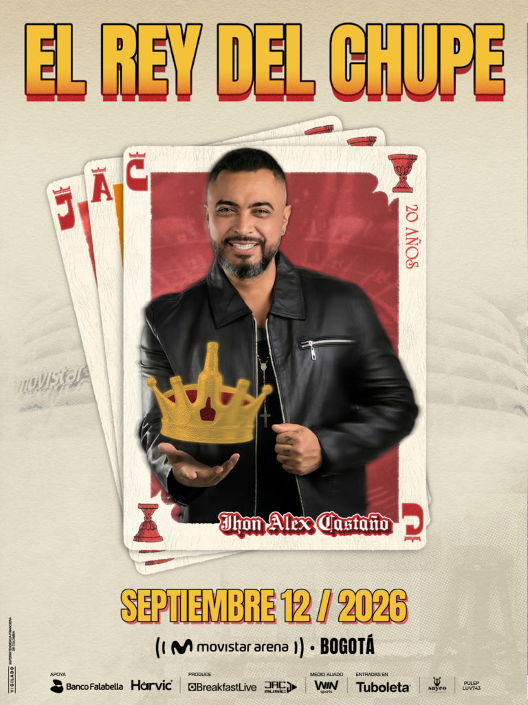 El artista colombiano Jhon Alex Castaño, reconocido como “El Rey del Chupe”, anunció su primer gran concierto en el Movistar Arena, un espectáculo con el que celebrará dos décadas de trayectoria musical.