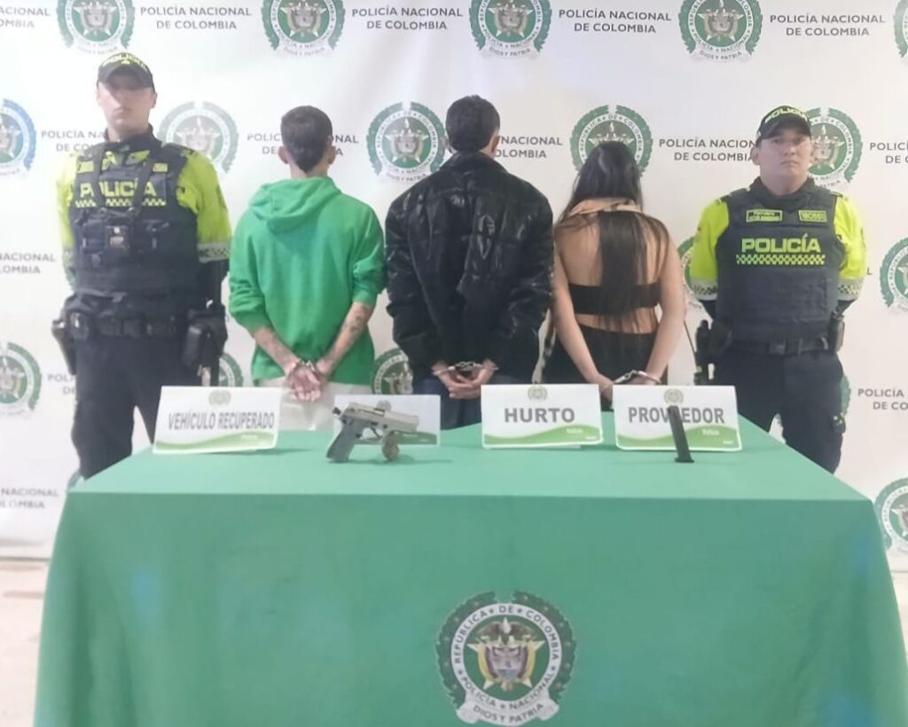En el occidente de Bogotá, la Policía Nacional capturó a dos hombres y una mujer que habían hurtado un vehículo de servicio de plataforma digital en el barrio Castilla, localidad de Kennedy. Los delincuentes intimidaron al conductor con un arma de fuego y lo abandonaron en el sector de Visión Colombia.
