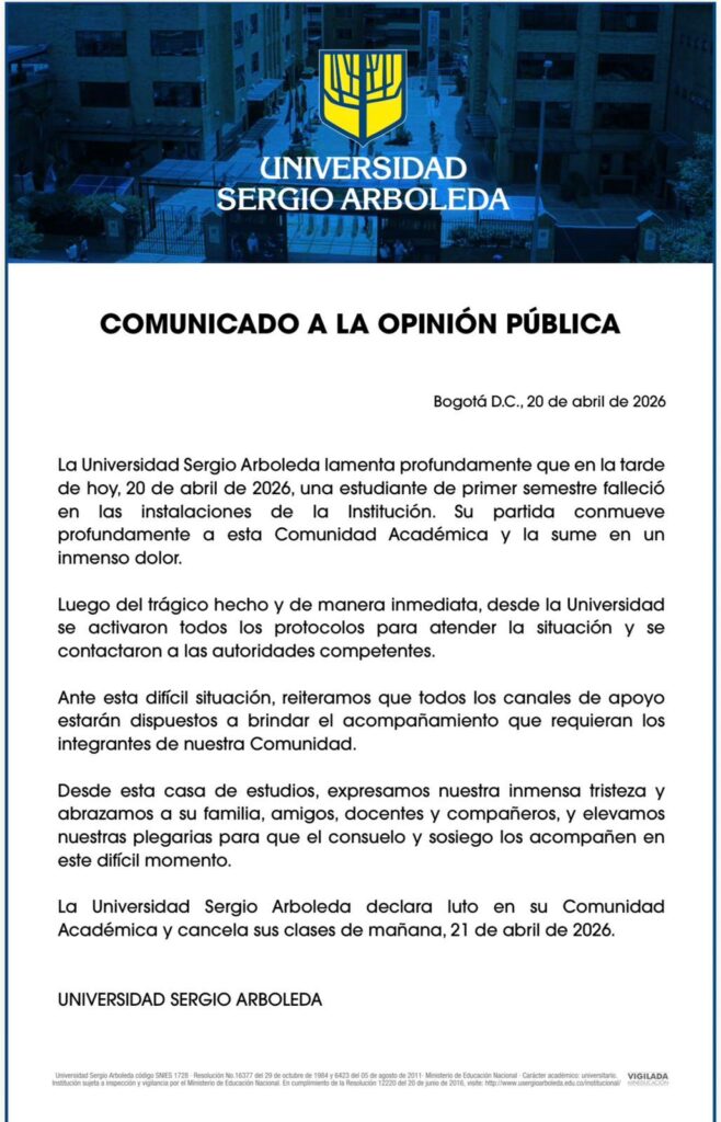 La Universidad Sergio Arboleda confirmó el fallecimiento de una estudiante de primer semestre, hecho que ha generado profunda conmoción en la comunidad académica. A través de un comunicado oficial, la institución expresó su dolor y solidaridad con la familia, señalando que la noticia enluta a toda la universidad.